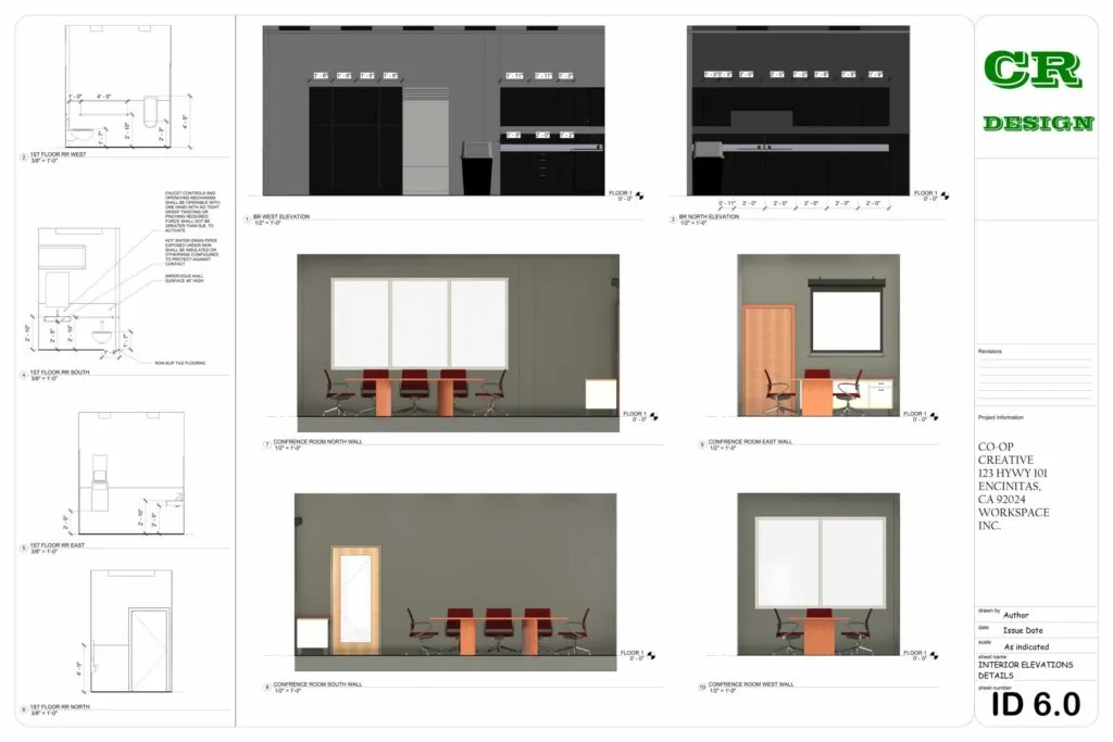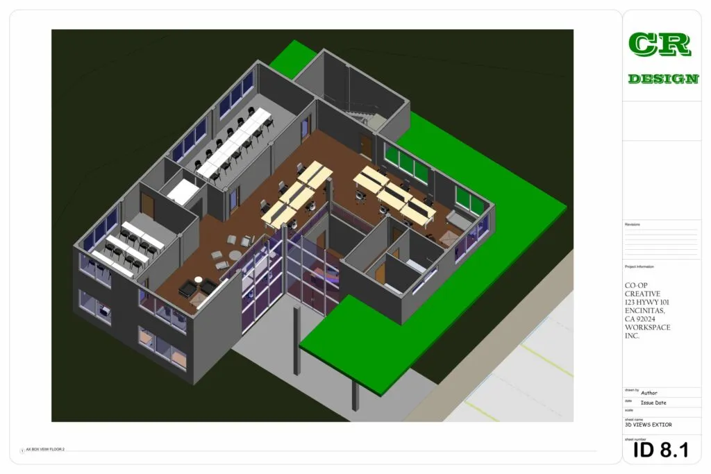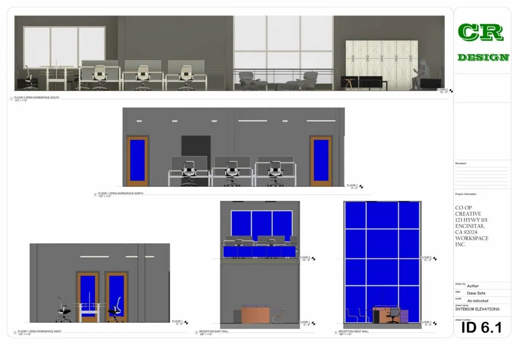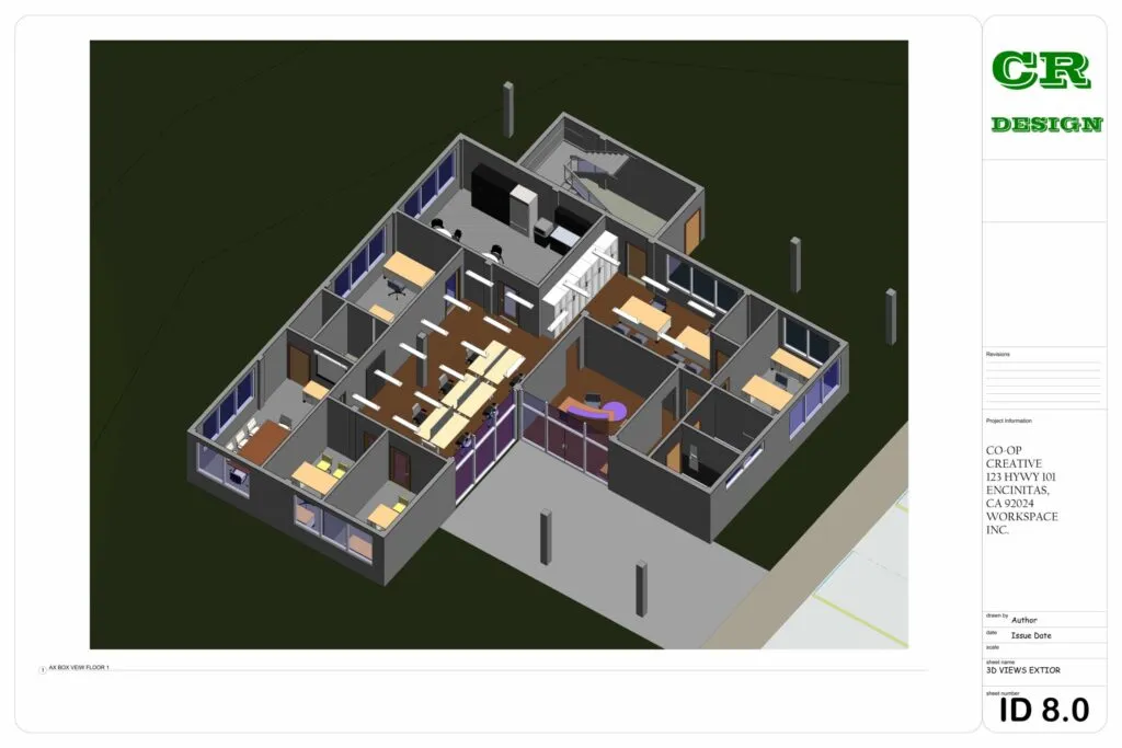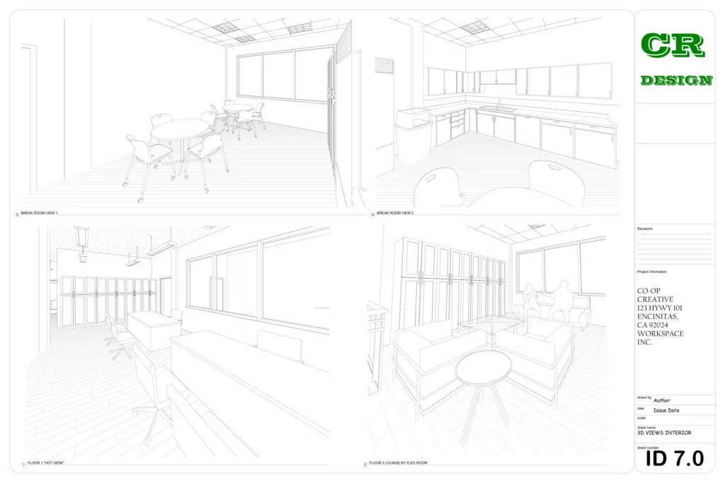 This commercial interior design project presents a contemporary workspace tailored for Co-Op Creative, located at 123 HWY 101, Encinitas, CA. The design emphasizes functionality, collaboration, and modern aesthetics through an open-plan layout, clean lines, and the strategic use of natural light.